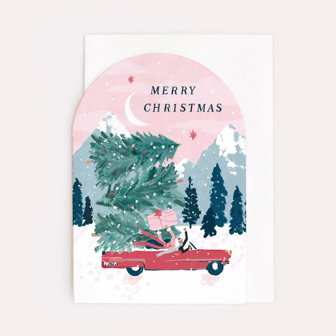 Illustrierte Grußkarte mit weißem Kuvert. Die Karte ist in Bogenform ausgestanzt.